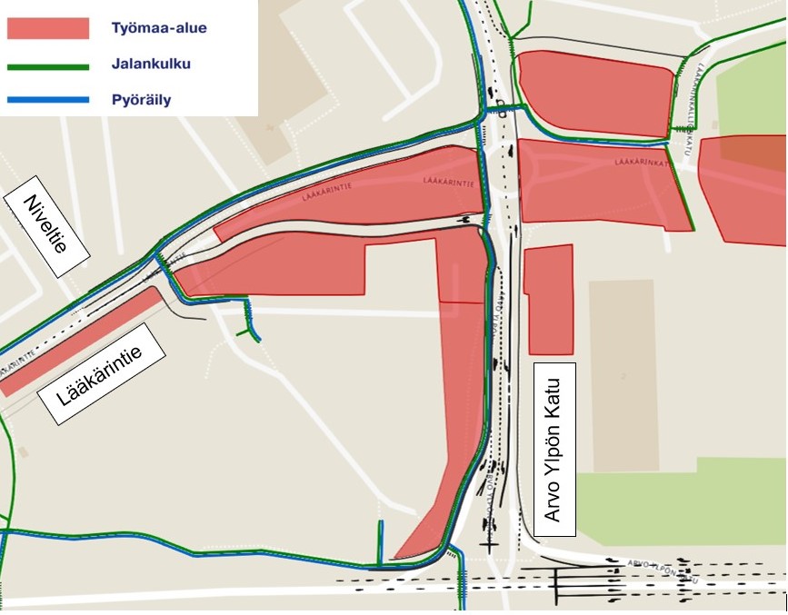 • Lääkärintien ajoneuvoliikenne Taysin suunnasta Arvo Ylpön kadun suuntaan siirtyy kulkemaan kiskojen yli kadun eteläreunaan.