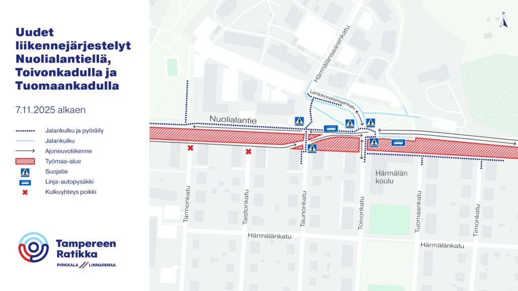 Nuolialantiellä otetaan viikkojen 44 ja 45 aikana käyttöön uusia liikennejärjestelyjä Kannistonkadun ja Leirintäkadun välisellä osuudella, kun liikennettä siirretään valmistuneille alueille. Lisäksi kulkureitteihin tehdään muutoksia Toivonkadun ja Tuomaankadun liittymien kohdalla.