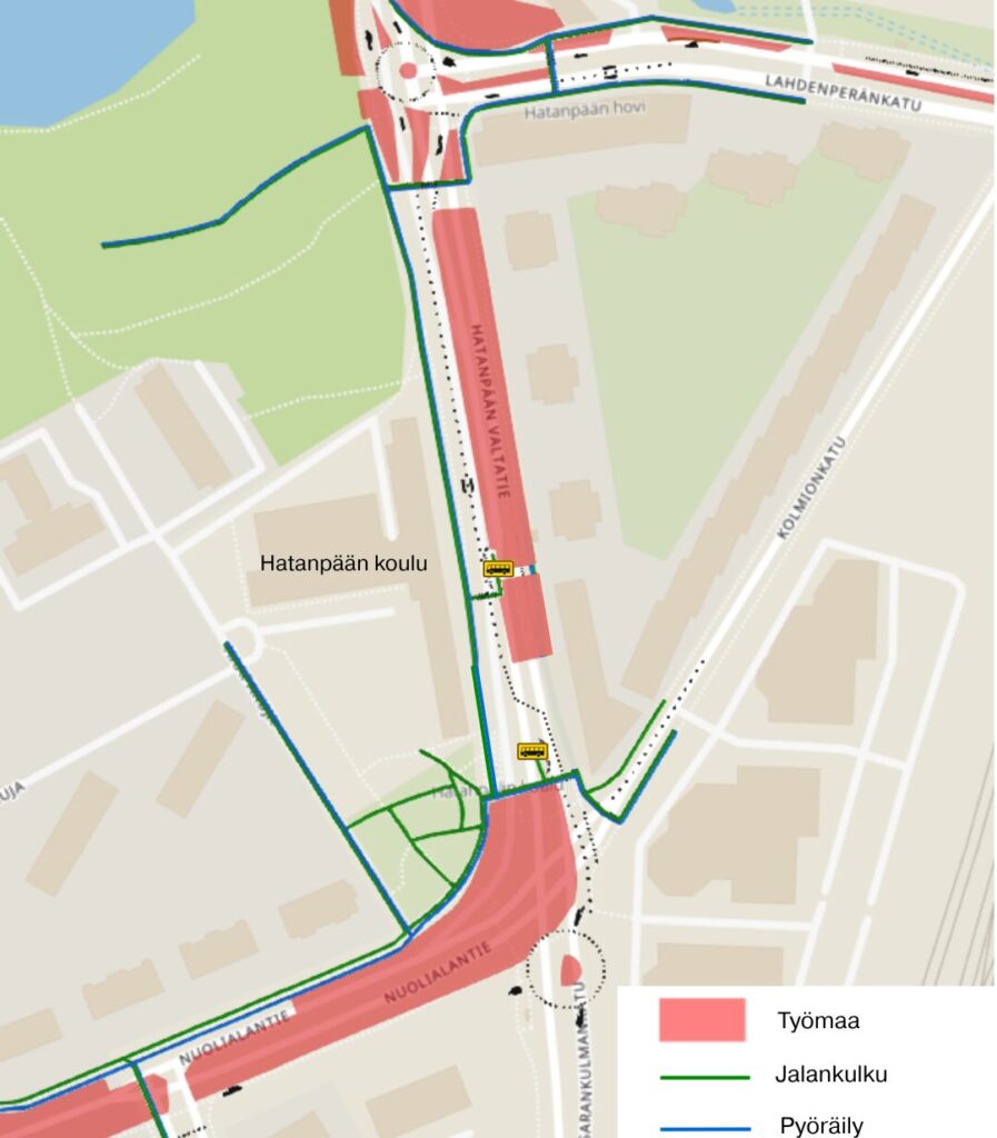 - Hatanpään valtatien ylittävät suojatiet sijaitsevat Lahdenperänkadun eteläpuolella ja Nuolialantien pohjoispuolella. Suojateiden sijainnit voivat hieman vaihdella töiden edetessä. Kulkuyhteydet kiinteistöille ja bussipysäkeille varmistetaan kaikissa vaiheissa.