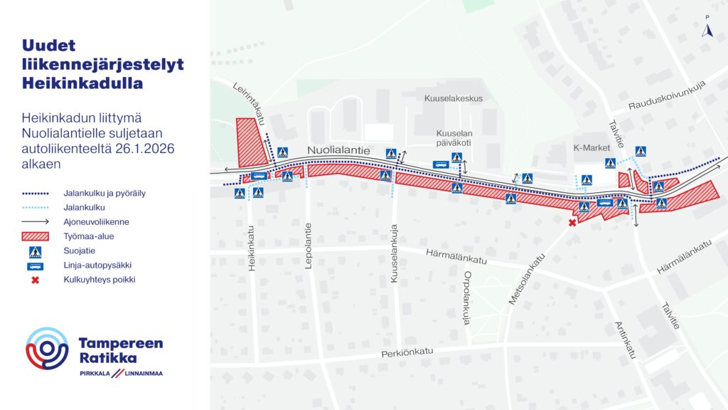 Nuolialantiellä jatketaan kunnallistekniikan töitä. Töiden vuoksi Heikinkadun liittymä Nuolialantielle suljetaan autoliikenteeltä maanantaina 26.1. Muutos on pysyvä.