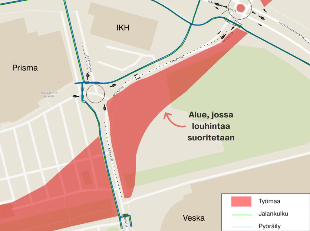 Lisäksi alueella tehdään muutoksia kulkureitteihin keskiviikkona 29.10. Kenkätien itäpuolen, eli Kauppakeskus Veskan puoleinen jalankulku- ja pyöräilyväylä suljetaan Naistenmatkantien ja kauppakeskuksen väliseltä osuudelta. Kulku ohjataan kadun toista puolta. Järjestely on voimassa toistaiseksi.