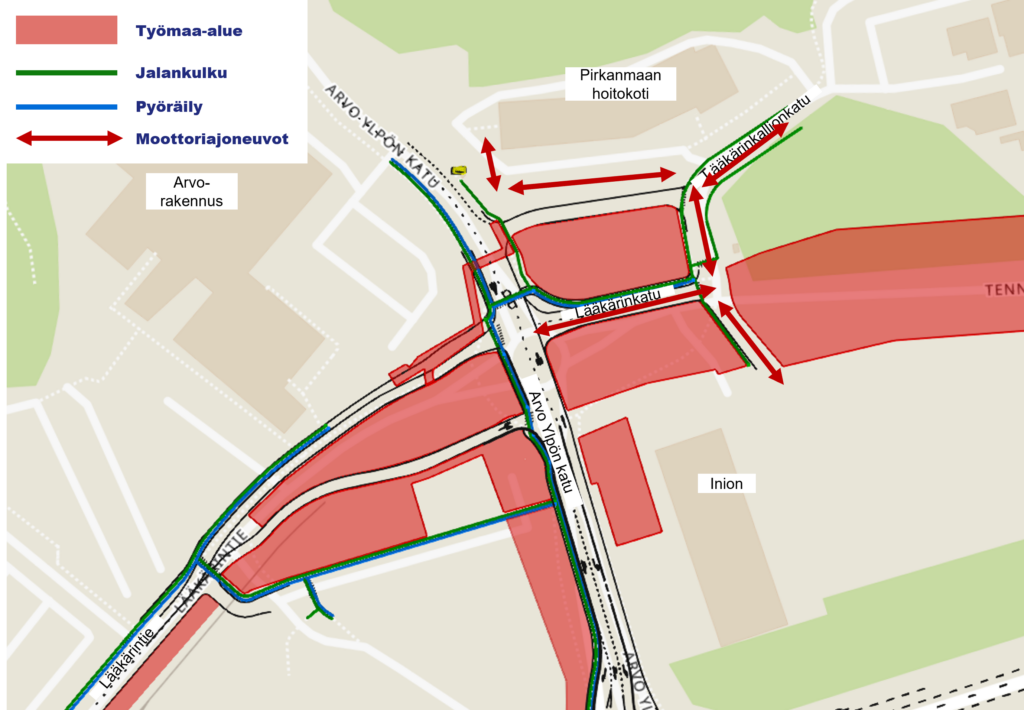 Lääkärinkallionkadun liikenne siirretään kulkemaan Lääkärinkadun kautta tiistaista 24.2. alkaen. Työn aikana liikenne Arvo Ylpön kadulla sujuu normaalisti kaivannon päälle laitettavilla ajosilloilla. Opastamme kulkureitit työmaan ympäristössä.
