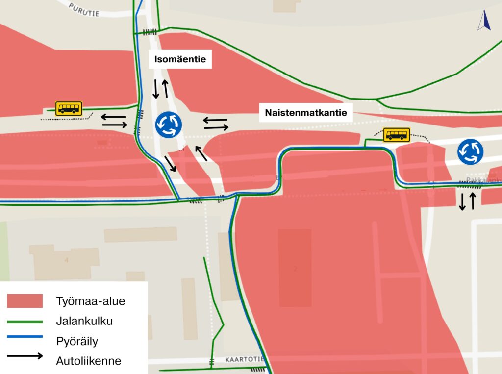 Muutosten yhteydessä bussipysäkki Pakkalankulma 7003 siirretään Lidlin edustalta liikenneympyrän länsipuolelle eli lähemmäs Isomäentien risteysaluetta. Jalankulku- ja pyöräilyväylä Naistenmatkantien eteläreunassa pysyy käytössä, mutta suojateiden ja kulkureittien sijainnit voivat vaihdella töiden edetessä.