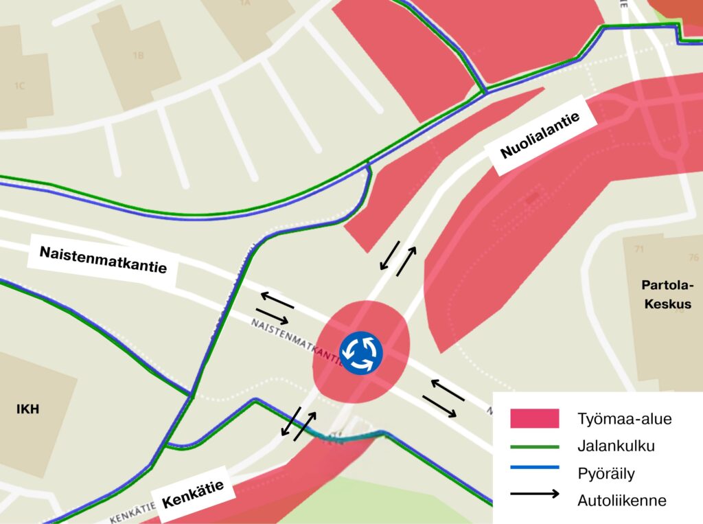 Naistenmatkantien ja Nuolialantien risteyksen liikenneympyrää suurennetaan, ja ympyrän keskialue otetaan työalueeksi. Samalla myös liikenneympyrän vapaat oikeat kaistat suljetaan. Muutosten yhteydessä ajokaistoja siirretään tien pohjoisreunaan ympyrän pohjoispuolella Nuolialantiellä. Jalankulku- ja pyöräilyväylän sijaintiin ei tehdä muutoksia.