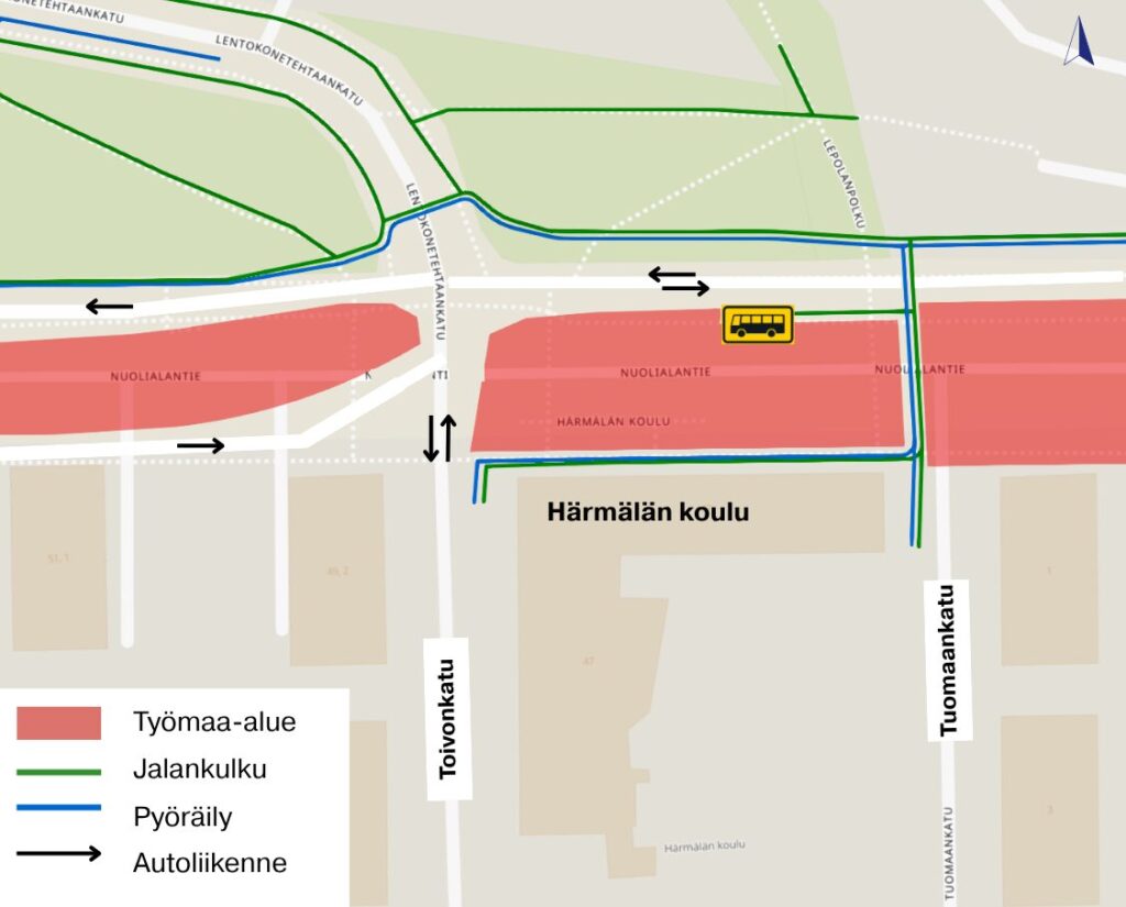 • Nuolialantien ylittävä suojatie siirtyy Toivonkadulta Tuomaankadun kohdalle. Toivonkadun risteys on toistaiseksi vain ajoneuvoliikenteen käytössä. Koulun edessä sijaitseva jalankulku- ja pyöräreitti pysyy käytössä.