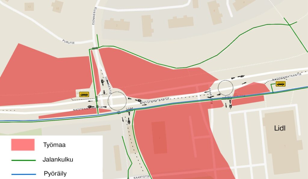 - Naistenmatkantien ajokaistat siirretään kadun eteläreunaan Isomäentien ja Lidlin välillä tiistain ja keskiviikon välisenä yönä 11.–12.11.
