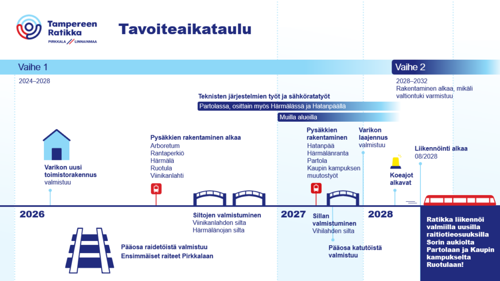 Kokonaisuudessaan Tampereen Ratikan Pirkkala–Linnainmaa-raitiotien rakentamistöistä on vuoden 2026 lopussa valmiina noin kaksi kolmasosaa. Lopulliset liikennejärjestelyt tulevat käyttöön jo vuoden 2027 aikana. Ratikkaliikenne Kaupin kampuksen ja Ruotulan pysäkkien sekä Sorin aukion ja Partolan pysäkkien välillä alkaa elokuussa 2028.