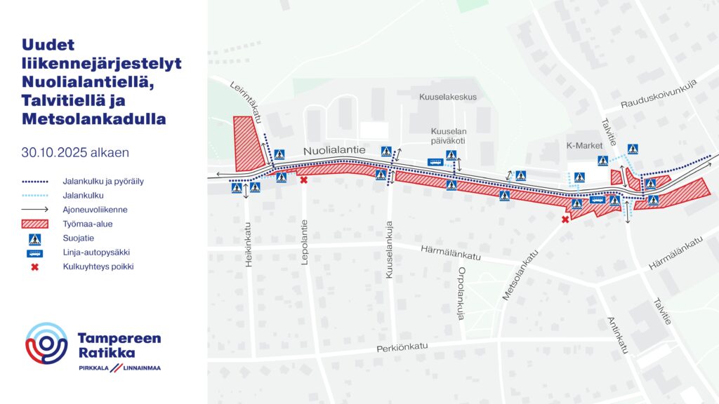 - Tuomaankadun, Timonkadun, Tierankadun, Matinkadun ja Mikonkadun liittymät Nuolialantielle ovat toistaiseksi suljettu autoliikenteeltä. Liikenne ohjataan kulkemaan Tuomaankadun ja Heikinkadun kautta. Jalankulun ja pyöräilyn yhteys säilyy kaikissa liittymissä työvaiheen ajan. Jalankulkureitin sekä suojatien paikat voivat töiden aikana hieman vaihdella.