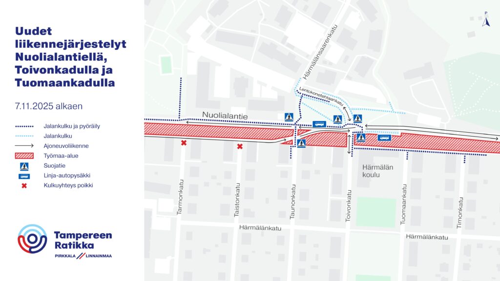 - Myös Tarmonkadun, Taistonkadun ja Taunonkadun liittymät Nuolialantielle osuudella Toivonkatu-Perkiönkatu on suljettu. Töiden vuoksi jalankulku ja pyöräily näillä kohdilla on opastettu Nuolialantien pohjoispuolelle. Autoliikenne Nuolialantieltä Tarmon-, Taiston- ja Taunonkaduille kulkee muiden liittymien sekä Härmälänkadun kautta. Jalankululle ja pyöräilylle pyritään pitämään kulkuyhteys myös Taunonkadun kohdalta.
