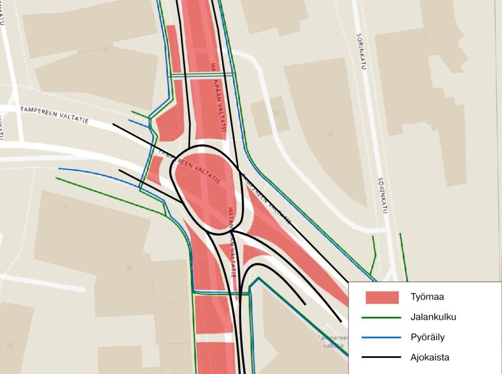 - Hatanpään valtatien ja Hatanpäänkadun risteysalueella työalue on Hatanpäänkadun eteläpuolella. Ajokaistat sekä jalankulku- ja pyöräväylä kulkevat kadun pohjoispuolta. Liittymä Hatanpäänkadulta jätevedenpuhdistamolle pysyy käytössä. Työt eivät vaikuta bussipysäkkeihin Sarvis ja Hatanpään vt 25.