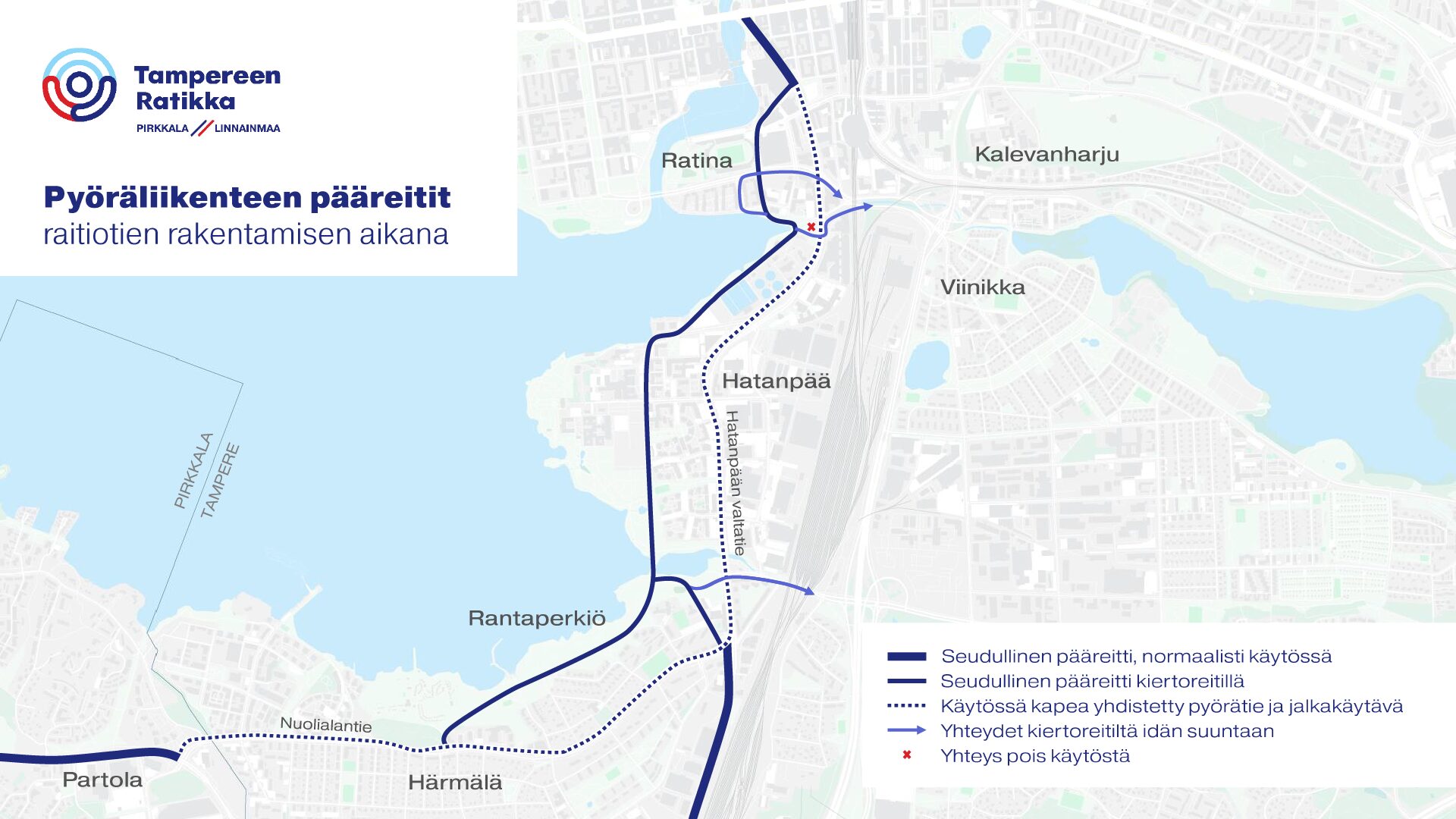 - Raitiotien rakennustyöt siirtävät pyöräilyn seudullisia pääreittejä. Uusi pääreitti kulkee Hatanpään läpi pitkin Vihilahdenkujan puistoreittiä ja Härmälässä pitkin Pyhäjärven rantareittiä. Lisää tiedotteessa