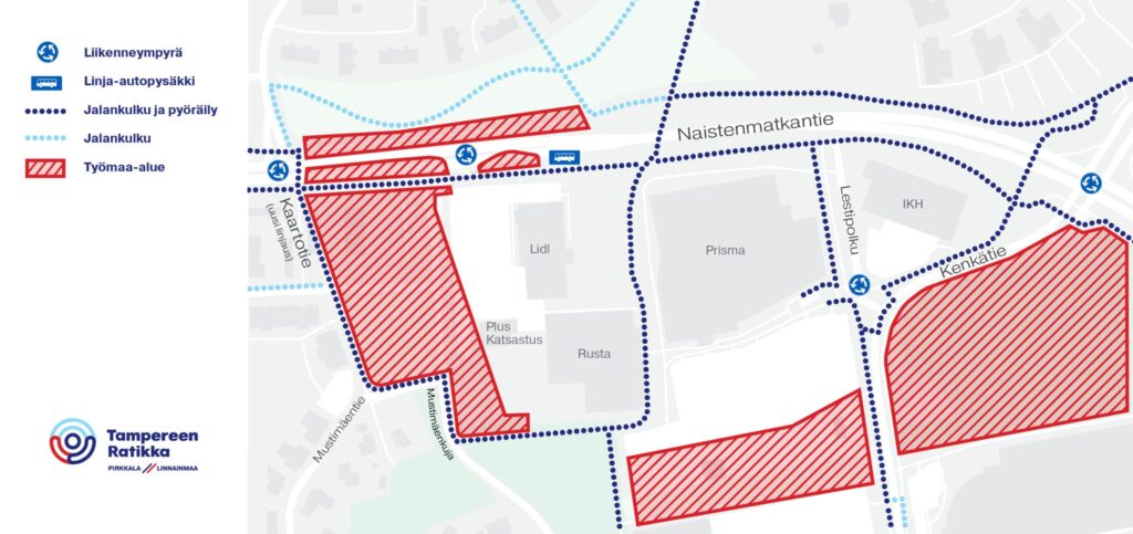 - Naistenmatkantiellä on käynnissä kunnallistekniikan rakentaminen ja syksyn aikana aloitetaan myös sähkönsyöttöaseman työt. Pohjoispuolen jalankulku- ja pyöräväylä on suljettu Lidlin ja Pirjolantien välillä.