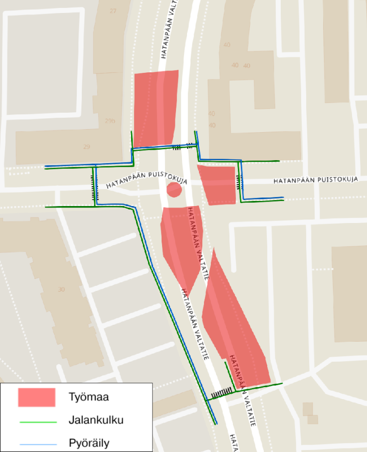 Työalueet ja kulkureitit Hatanpään valtatien ja Hatanpään puistokujan risteysalueella 24.9. alkaen.